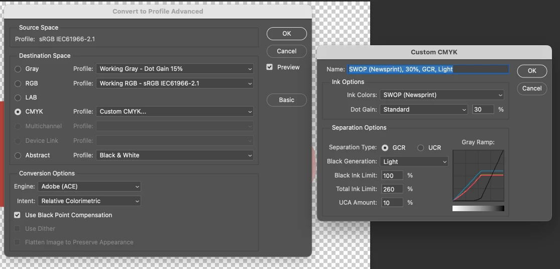 @JKA@4153 Its been an age, but a. replyu popped up and I wanted to mention that creating this kind of 'faux CMYK profile' in Photoshop is not a good idea at all, you ideally need to work with a vendor who uses proper ICC CMYK profiles to characterise the printing process. The "custom CMYK" process you'd have to use is a holdover from Photoshop v4 back in the late 1990's as far as I know.