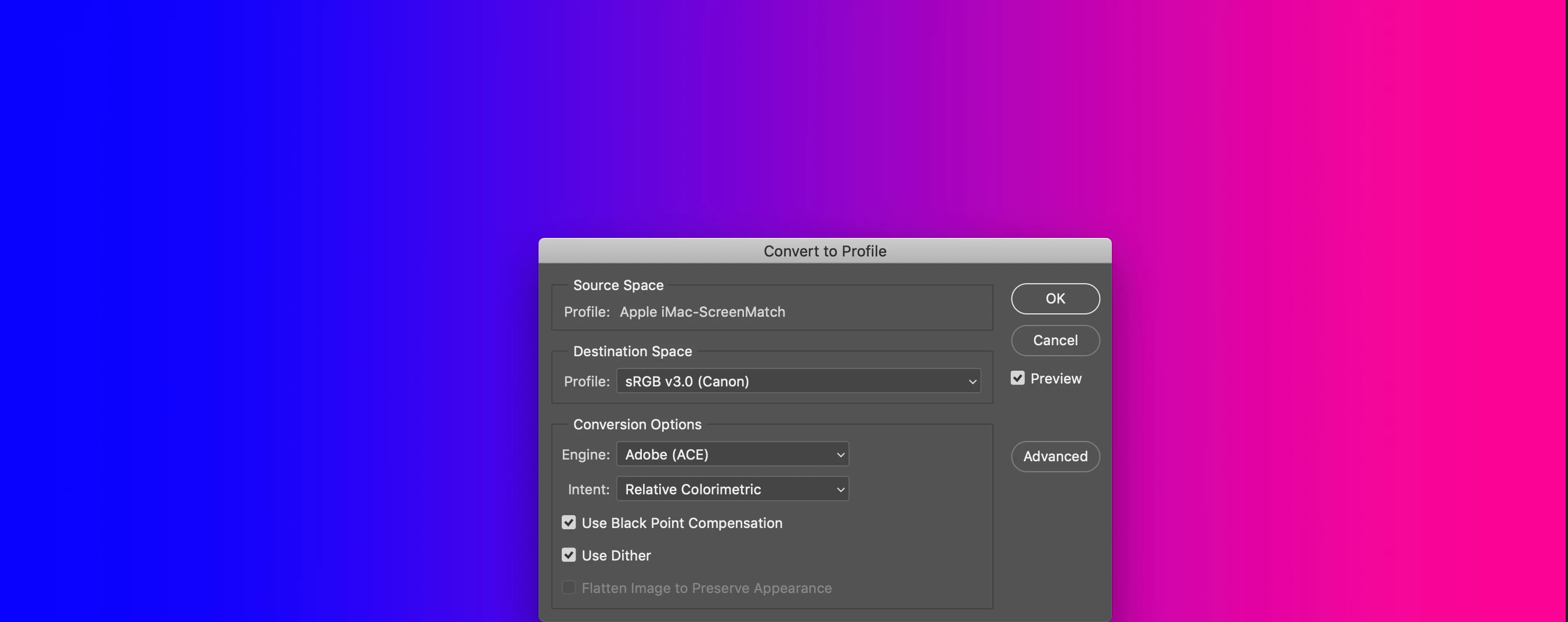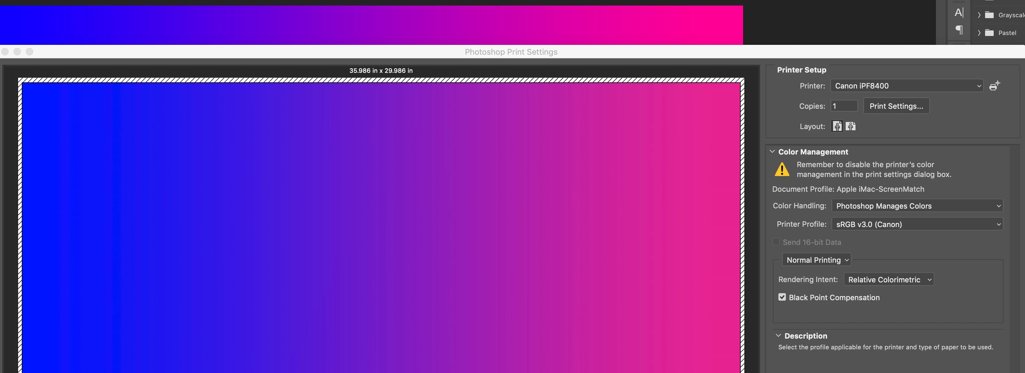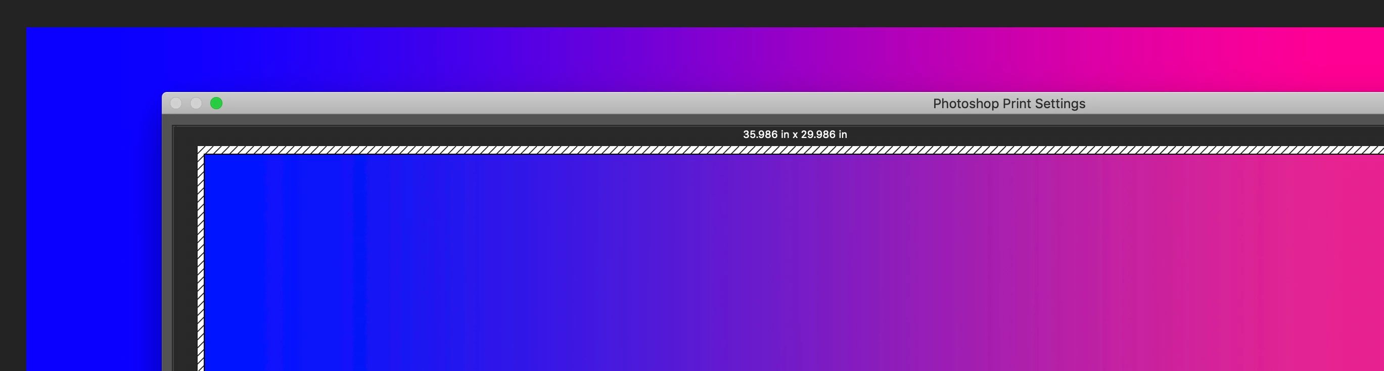 I've noticed that when I go to print images in Photoshop, the print preview is less vibrant and more washed out than the actual document. Here is an example. The vibrant gradient below is the basic document: