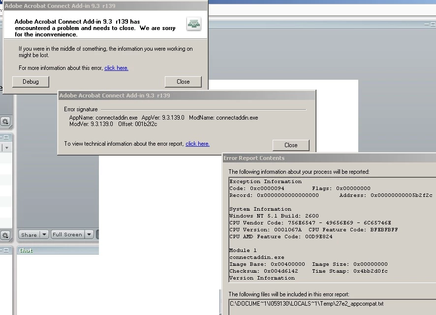 Adobe Acrobat Connect Add-in 9.3 r139 has encountered a problem