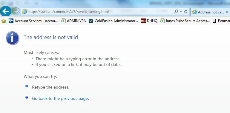 I have several issues with this. First off Internet Explorer doesn't work on some pages but Chrome does show the requested page. Also this when clicking Event Management then clicking Event Templates I get a weird URL of http:///content/connect/c1/7//event_landing.html what is really strange is my site is using port 443 and is a https site. This link pops up in various pages.