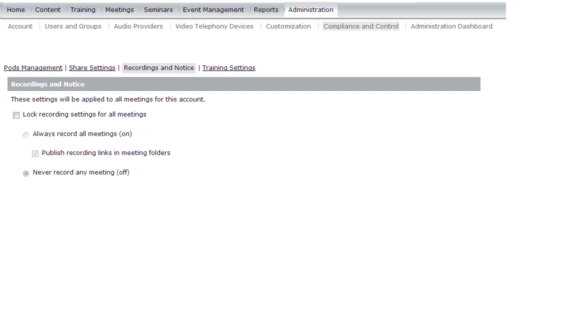When meeting room owners start a meeting, it immediately starts recording. In Compliance and Control, the option for mandatory recording is on. How do we make it optional? The only other option in Compliance and Control seems to be to turn recording off. Thanks.