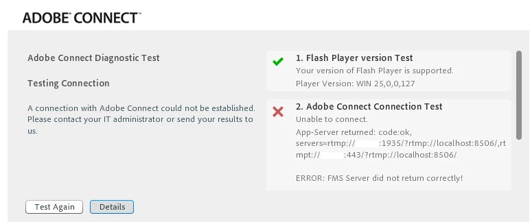 adobe connect connection test error