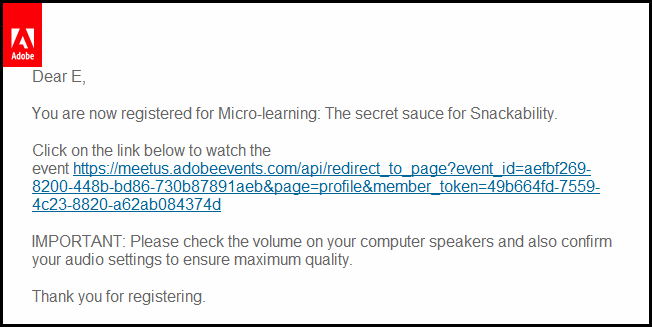 I'm having a problem viewing Adobe webinars using Connect. After I register, I receive a confirmation email with a link to view the webinar. However, the link opens the registration page again, and I can't view the webinar. Anyone else having this problem?