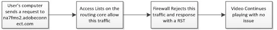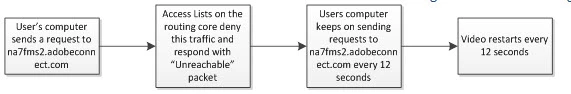 Adobe Connect seems to be unable to handle these responses and goes into a loop continiously attempting a direct connection (around every 10-12 seconds), therefore causing streaming video's to restart every 10-12 seconds.