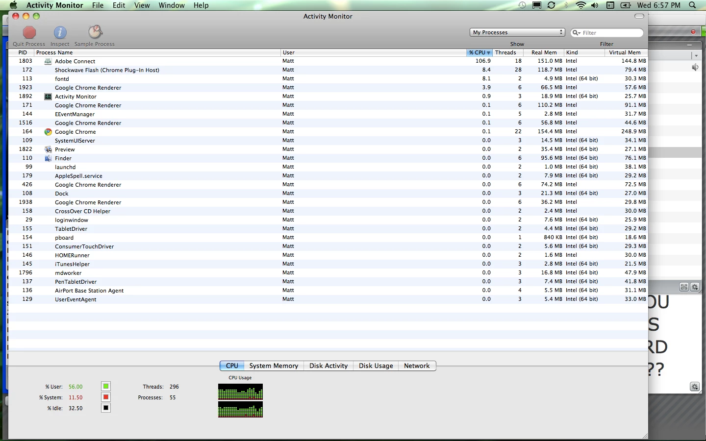 I have a macbook pro running Adobe Connect 8 with Snow Leopard 10.6.7. Ever since I installed snow leopard I am having major slow down problems in connect. I am an educator using Adobe Connect to broadcast my video and teach students. I looked at the activity monitor of my Mac while running a class in AC and the percentage of computer usage was jumping between 80 and 100% for Adobe Connect...that can't be right, right?