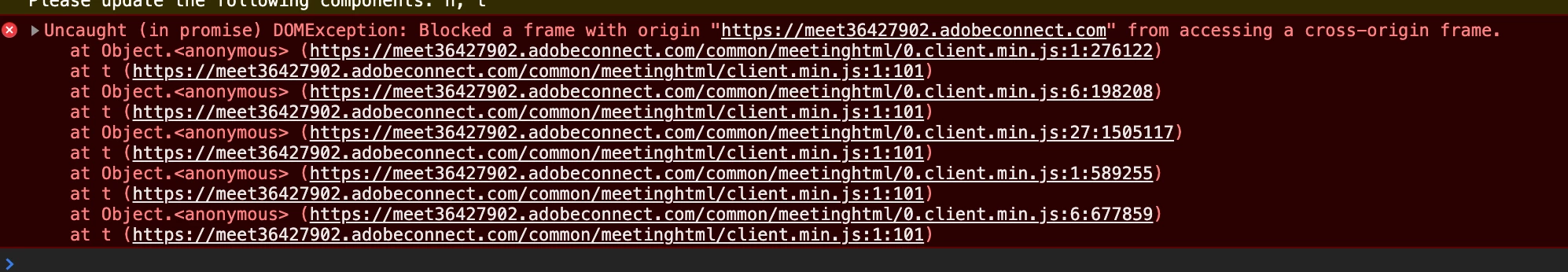 Uncaught (in promise) DOMException: Blocked a frame with origin "myAdobeServer" from accessing a cross-origin frame.The problem is client.min.js tries to reach top frame document and browser blocked because of same-origin policy.