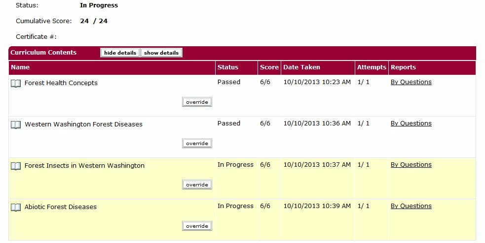 I am having a problem when users take a course and pass it, the system doesn't show it as passed but still in progress. In the image below I passed all 4 course modules quizes, but only the first 2 show passed, even though the score for each course was the maximum.