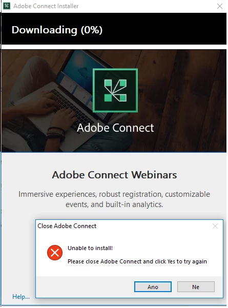 MMichal JežekParticipantForum|Forum|6 years agoApril 15, 2020QuestionError Adobe Connect installationForum|Forum|6 years agoApril 15, 20201 reply603 viewsHello I need to install Adobe Connetcion desktop App. Download is OK. When I run installer, message in attached file occours. I closed everything, restarted laptop. Situation is the same. Thank you for your help.Desktop application
