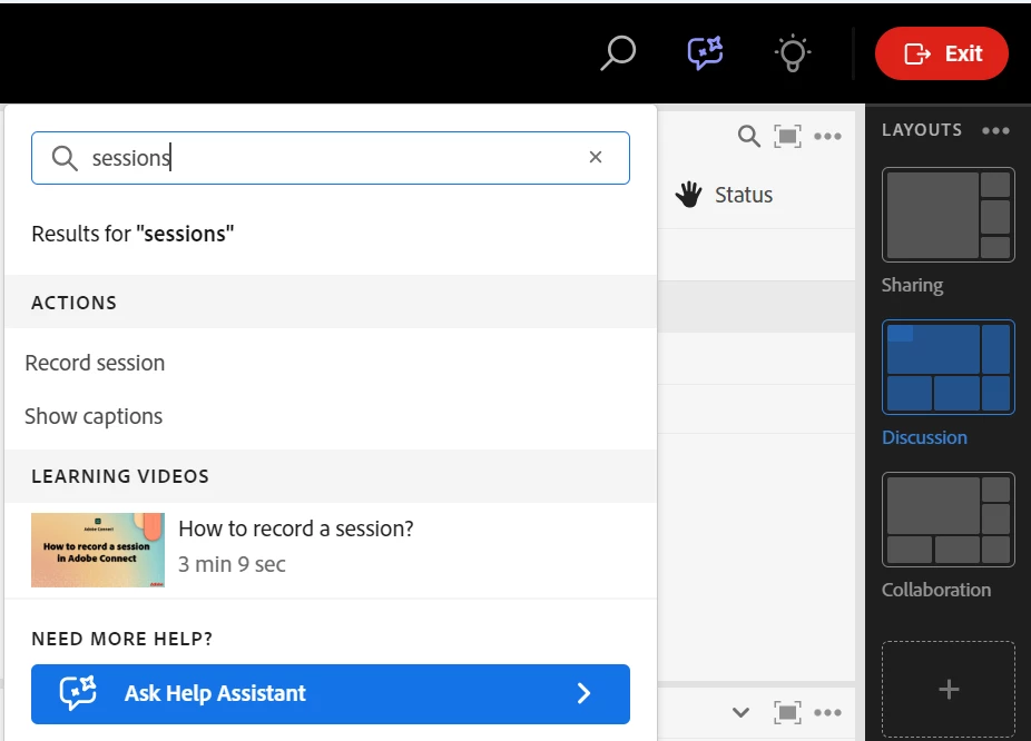 Your room search is now more than just a navigation tool. It is your central hub for control and knowledge in Adobe Connect, providing quick access, helpful guidance, and integrated learning all in one place.