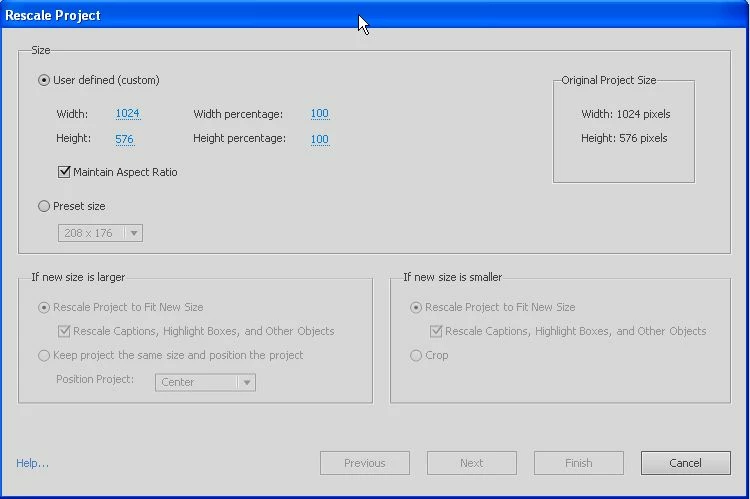 I use the project size 1024 x 576 pixels in captivate