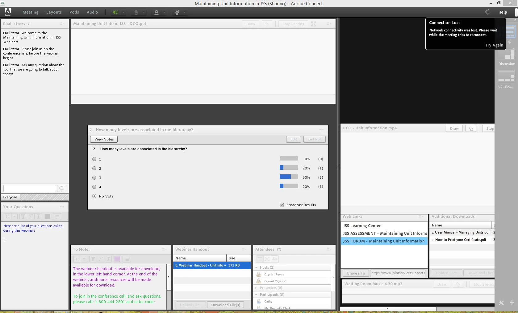 I was recently running a webinar with my company when Adobe Connect froze and a message box appeared, stating, “Network connectivity was lost. Please wait while the meeting tries to reconnect.”