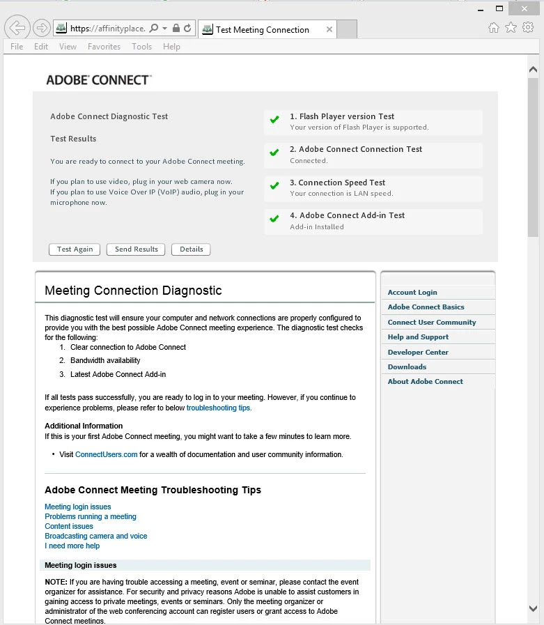 So I clicked Help > Troubleshooting and took the Adobe Connect Diagnostic Test. I passed. Every criteria was checked off successfully.