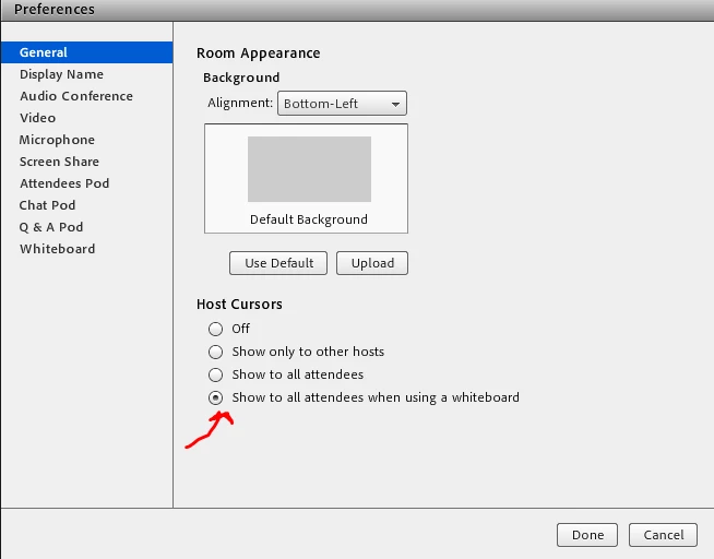 Is there a way for hosts and attendees to see the name of the user that adds text or pictures to a whiteboard?