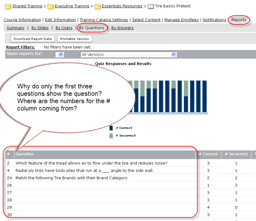 I have published a Captivate 6 quiz to Adobe Connect Pro 7.5 and created a Training module course for it. When I run a report on the course By Questions, only the first three slides display the text of the question. What's causing this? How can I fix it? Also, what do the numbers in the # column mean? The Captivate quiz file contains one intro slide, 25 questions slide, a score slide, and a certificate slide at the end. All the question slides are basically the same, only with different questions.