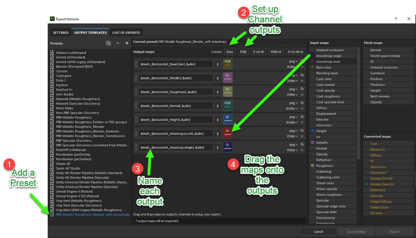 Set up a preset using the steps below, all outputs are greyscale except BaseColor and Normal: