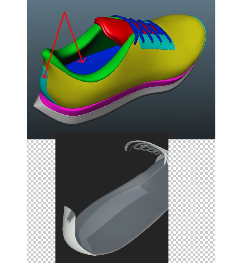 I've modeled a simple shoe that was set up in Maya. All the maps are generating correctly except for an AO map on these 2 pieces- getting strange artifacting- heel section is getting some lace shadows. I'm using default settings for map generation, so any help is appreciated, thanks