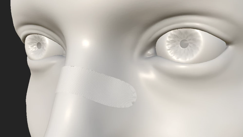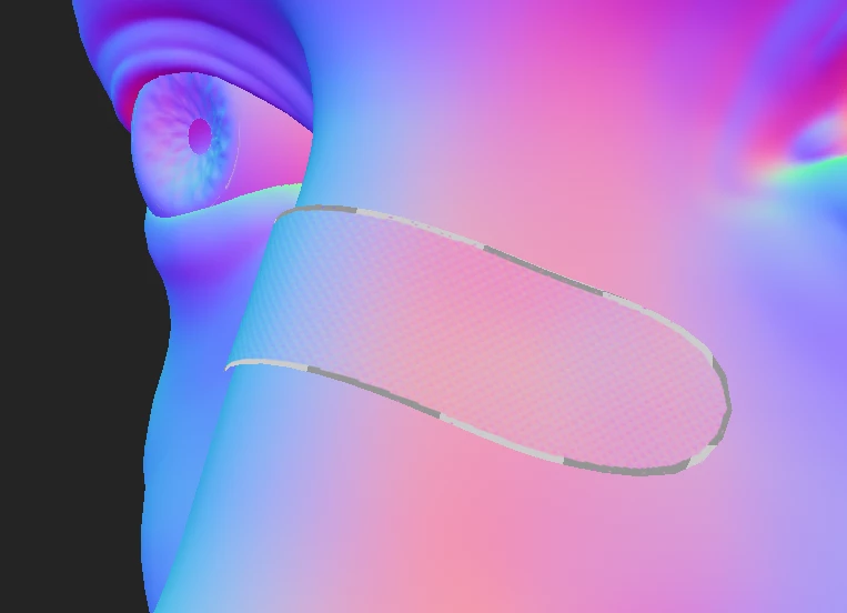 Hello! I'm trying to bake using cages in Substance Painter. The plaster on the nose should have dots on it uniformly, right up to the edges, but the edge has artefacts on it instead. During the bake, this image briefly appears where the artefacts appear: