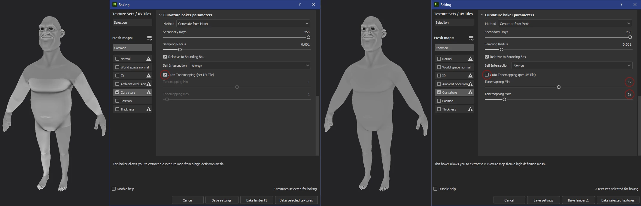 Just a little tip to enhance what you said. Do a first bake on all UV with a average resolution (to make it faster) and auto tonemapping enable. Then export a log file text, you can found it into "help" in the top bar. Open the text and scroll down to the end. You will found a Metadata of the curvature baking and it will show you the max / min value calculated by the render. This value should be the perfect value 97% of the time.