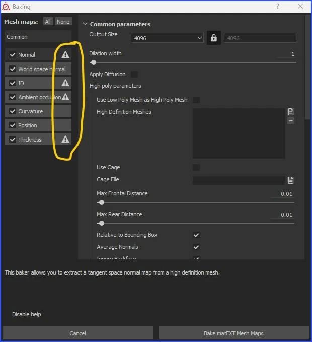 This may be due to the older version of Substance Im using. 2018.1.2 After baking maps and getting these errors in baking options window, I have no display of Normal and AO maps in the viewport. Do I have a display setting wrong? My Normal and AO maps seems to export correctly. Nowhere have I found an explanation of what these symbols mean in the bakign options window.