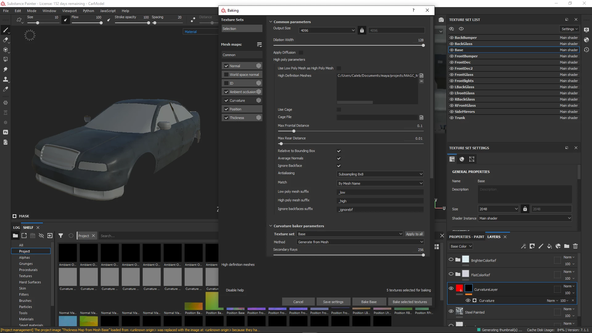 I'm working on a school project, and I have a high poly and a low poly version of a car model that I am trying to texture in Substance. When I bake the meshes, however, I lose the curvature. It seems no matter what I do to the settings it doesn't appear. I'm sort of new to this level of Substance so any help would be greatly appreciated.