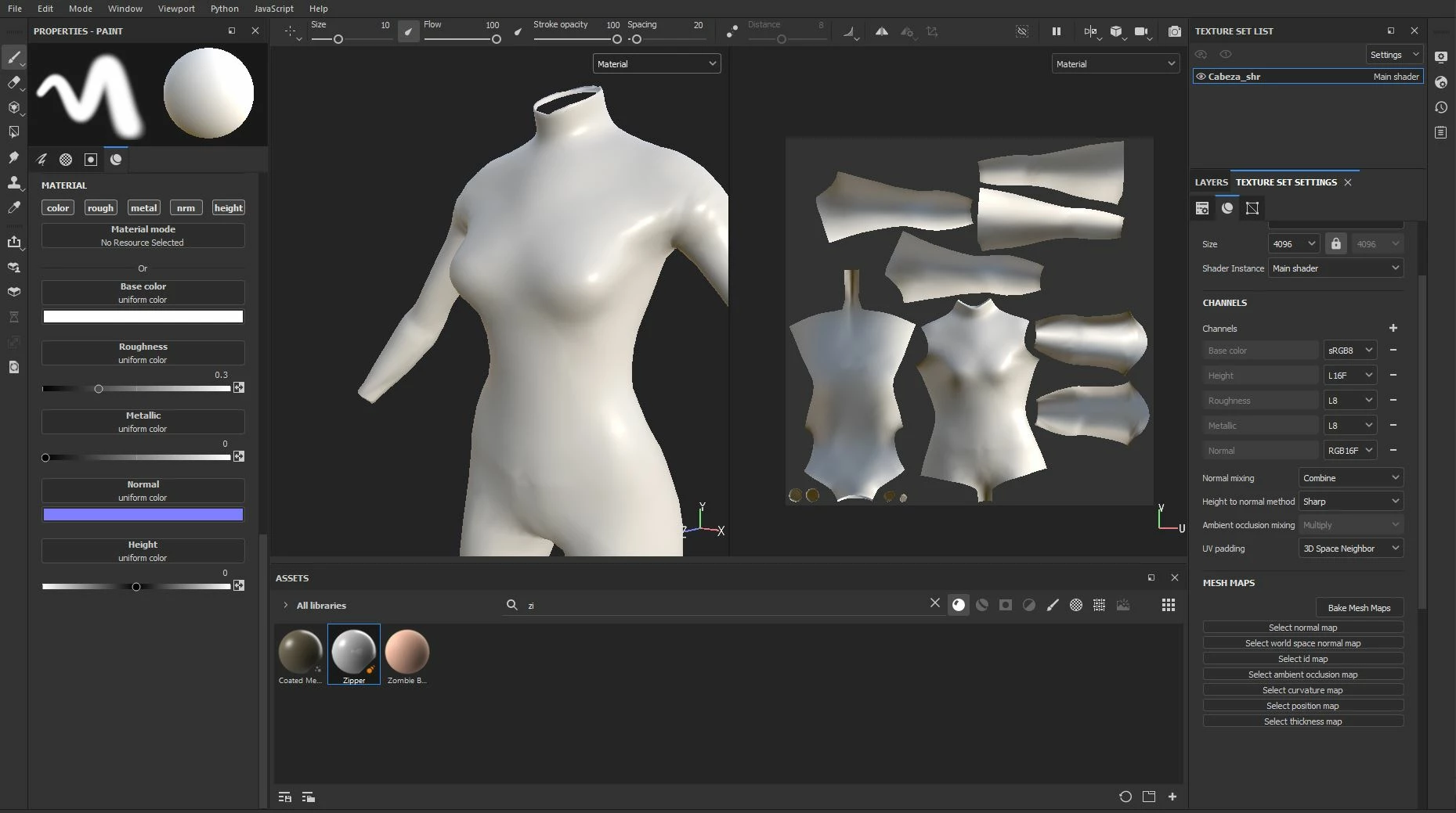 3 - i think this is the way but don't know how to do it, make low mesh jacket in substance get baked high poly jacket-zipper details as a single mesh, btw the zipper have no UV so far, will this bring some problem when trying to bake high to low?