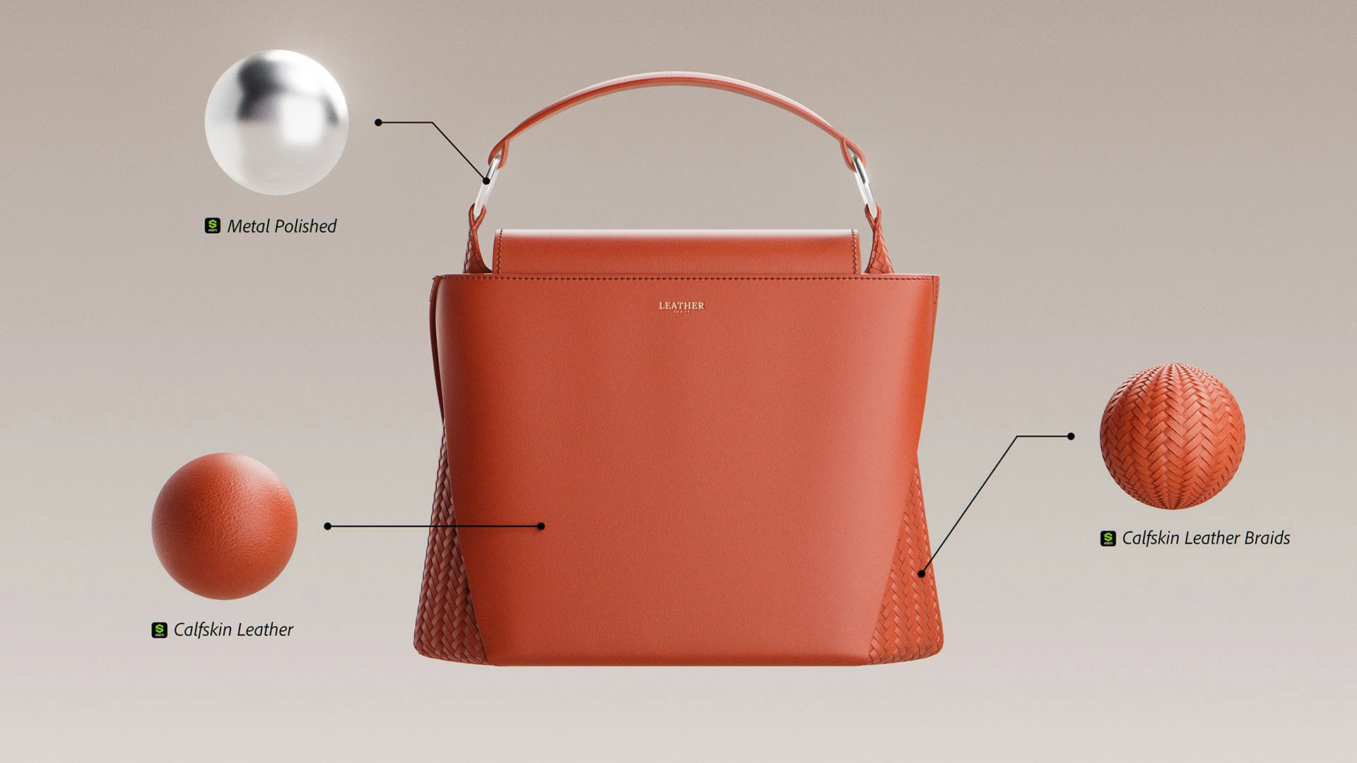 The 3D Assets team created a bunch of new models and materials to represent leather goods as part of this project—and, of course, all of the visuals in the project were textured with Substance 3D Painter. Those assets are available on Substance 3D Assets right now.