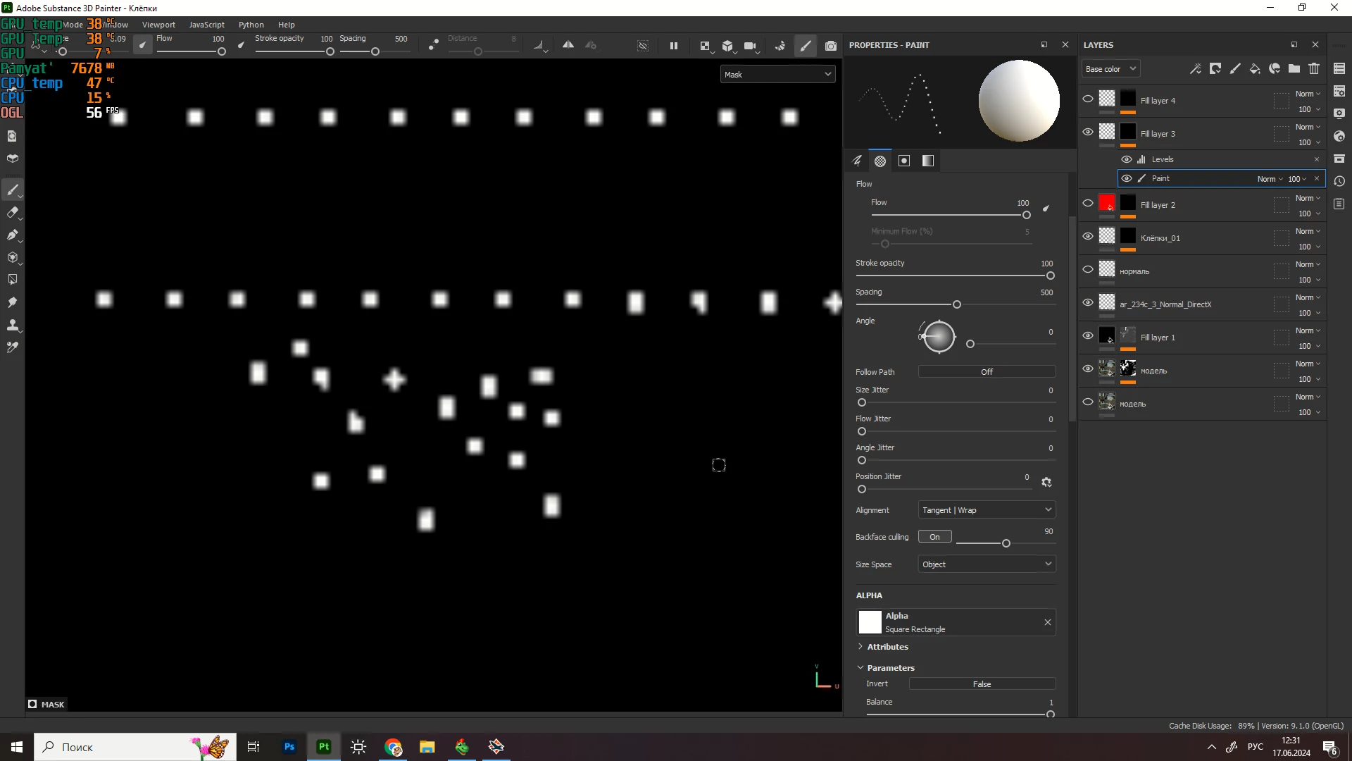 Hello! I'm painting rivets on a 3D model of an airplane using a brush with an alpha square size of 0.9. In fact, on a 3D scan and in Photoshop it is a full-fledged square measuring 4 pixels (2x2). But for some reason, Substance cannot draw a basic square; Instead of a square, I often end up with a quadrilateral, a triangle, etc. I played with Levels and effects, such as blur, but it did not help. Please, help