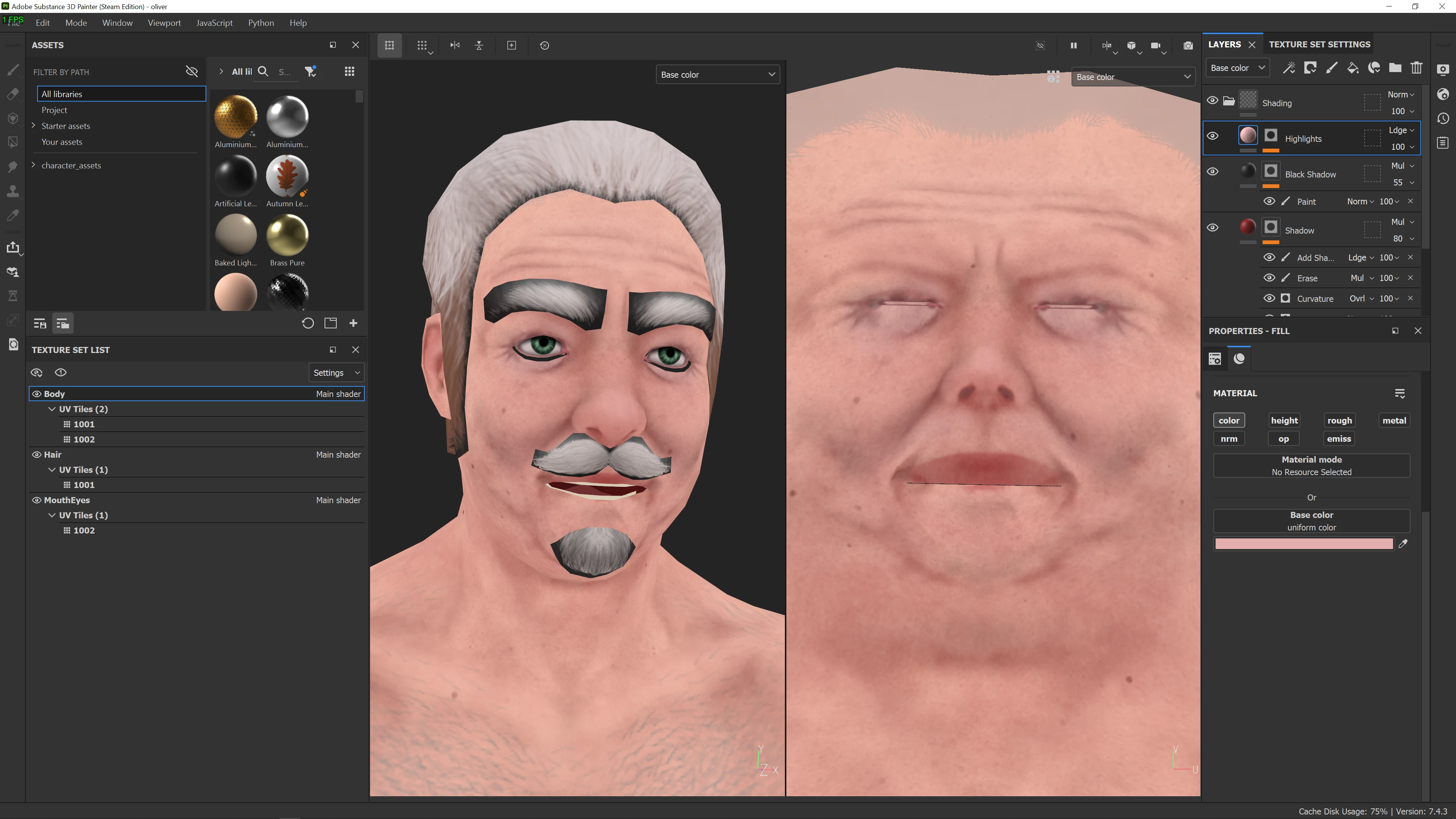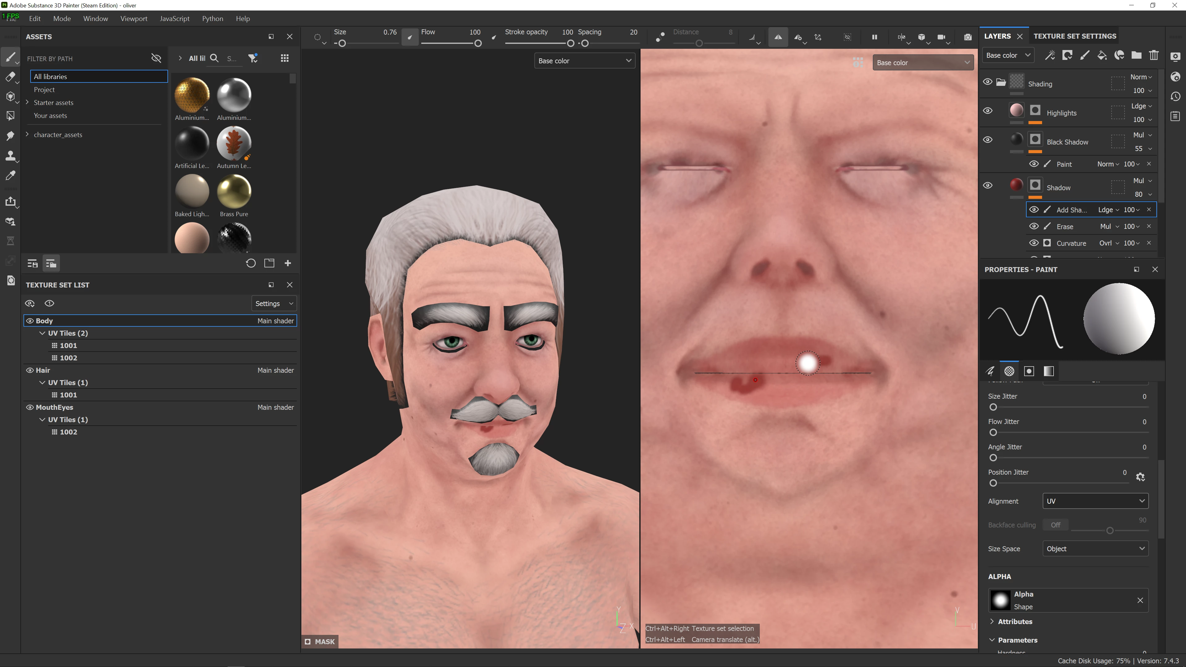 Essentially I'm having trouble painting these lips. Wanted to add some shadow on the top lip, but painting through the viewport fails to get all the lip. Fine, I'll paint on UV view. The problem there is no matter what alignment I set the brush to, it's still jittery and draws on the lower lip with symmetry on. Probably a thing with mirror projection but idk how to fix that. Second idea is to update his mesh with his mouth open, but when I do that it reprojects the texture regardless of the import settings I use. Easiest solution is just painting on UV without symmetry, I know, but I'd also like to know if there's another way around itr, to get it to project the way I want to and/or not reproject the textures when I update the mesh. Thank you.