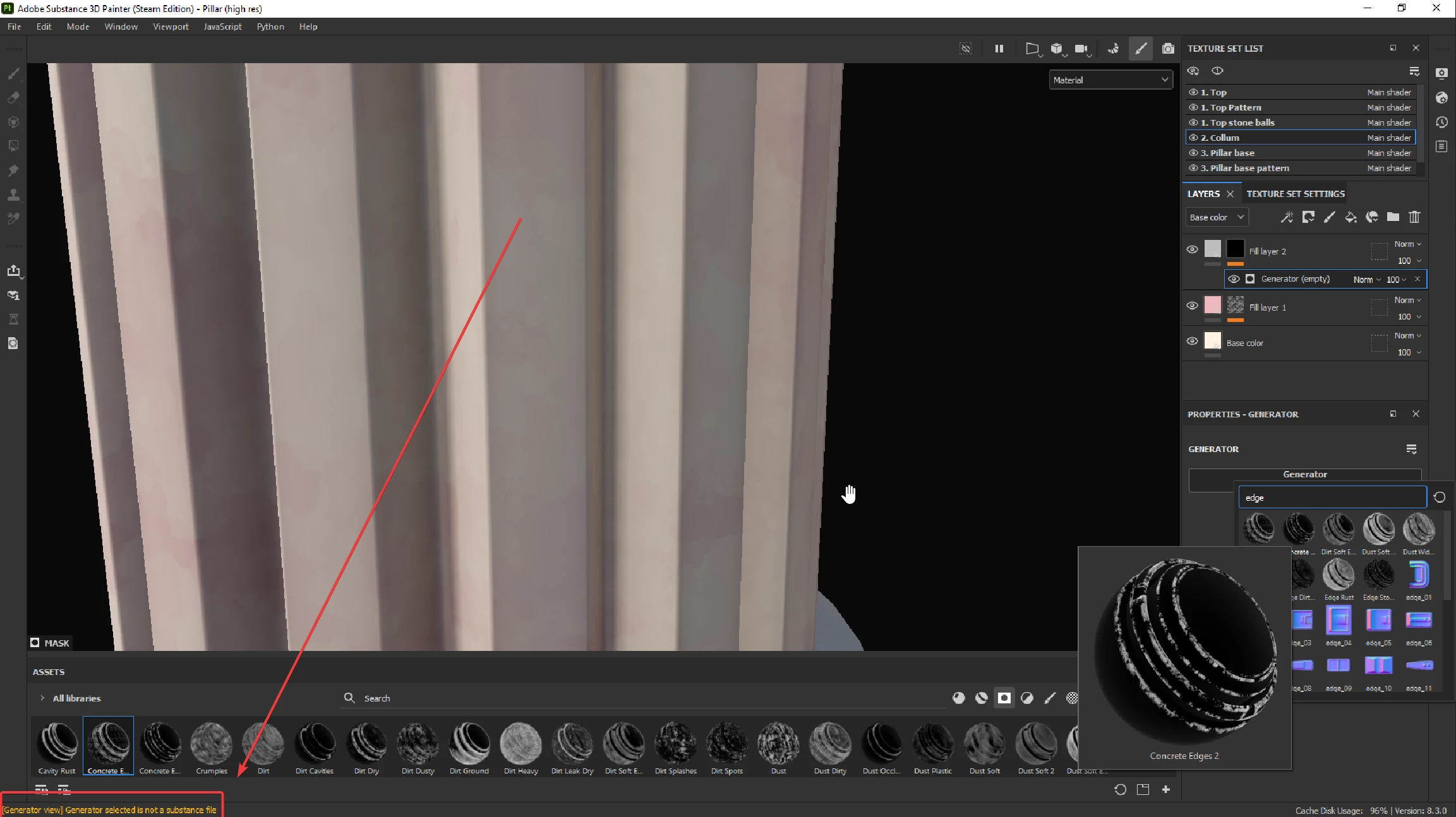 For your specific case, it's due to the fact that the concrete edge 2 isn't a generator, but a smart mask. I admit it, this is kind of confusing, because the smart masks have the same icon as the generators, but they aren't the same thing. In fact, you can even see a warning in your log.
