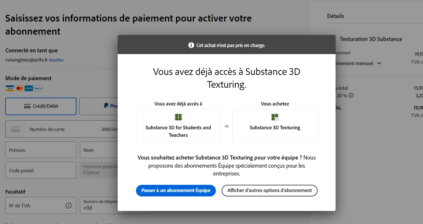 I wanted to download a material in order to use it in Substance Painter for one of my project. I have an education student/teacher license thanks to my school, but the library always send this message when I try to download a ressource, and says I need to purchase an abonnement. However, when I accept to get one, it only tall me I already have one, which is the case. I don't really know what's wrong, if someone already had this problem and can help me it would be cool.