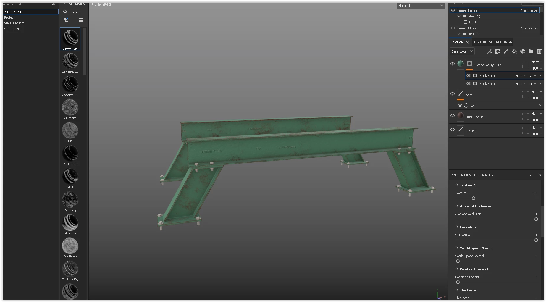 Attached is a screenshot of a model I am working on and my question is... Is there a way to combine the effects of 2 smart masks ? I would like to add some dirt at the web / flange area of the beams [ which could be classed as a Cavity in Painter.] I have got the effect I want by using Smart mask Dirt in Cavity but it lessens my Scratches mask, I have tried reducing the opacity of the cavity mask in order to also show the scratches, problem is I have to reduce it so much that it becomes too subtle. So is there a method to mix the full effect of both masks ? [ without lessening one mask ] You will see from the Yebis screenshot what I am trying to get across [ the Cavity rust mask is reduced to 33 % and is very weak ! ]