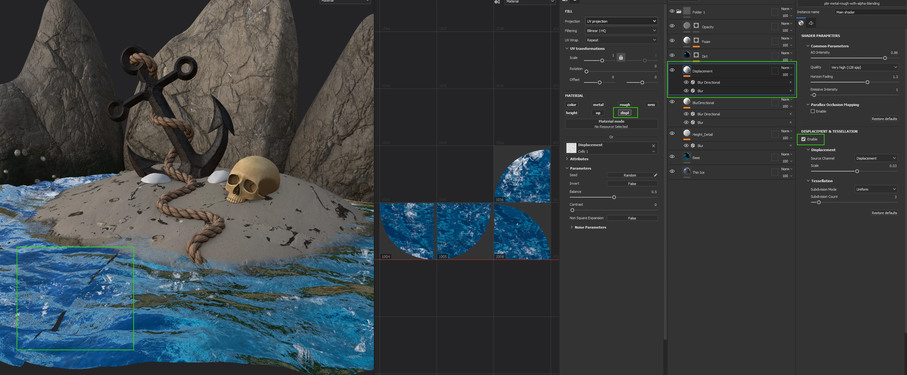 Just noticed it works okay in Planar or Warp Projection mode as long as the Filters (Blur Directional and Blur) applied to the Displacement Fill layer are turned off. I'm guessing because those effects make the Cells1 alpha I used for displacement, no longer seamlessly tileable...
