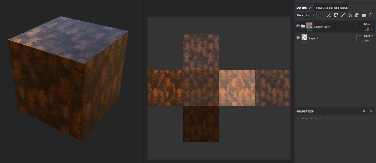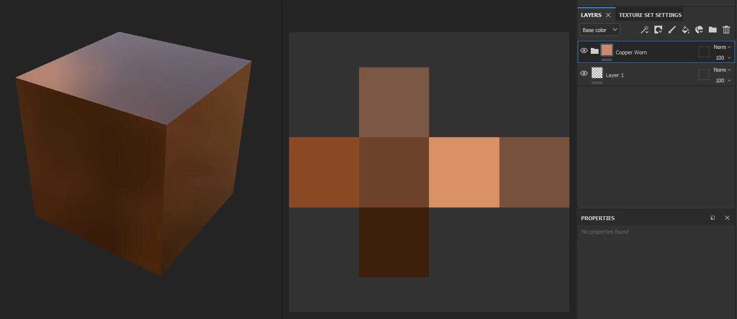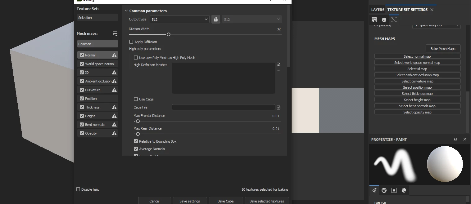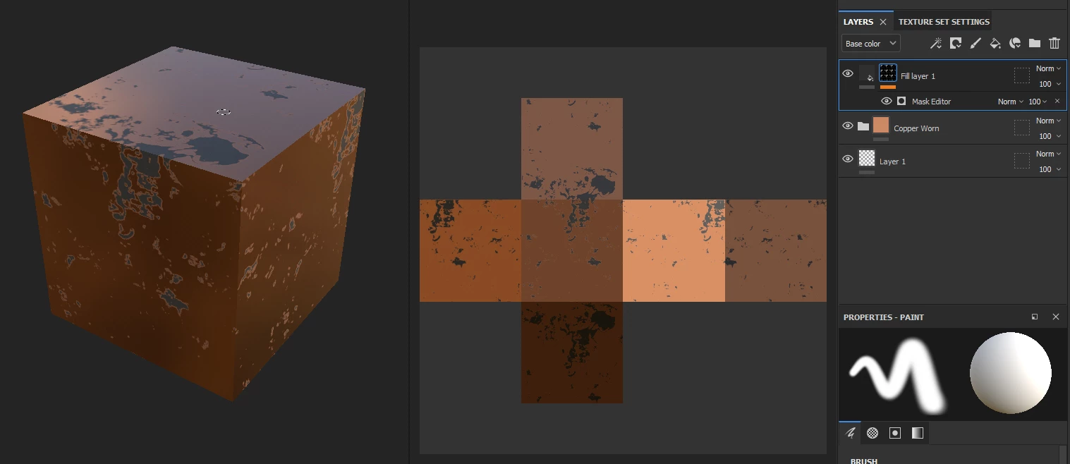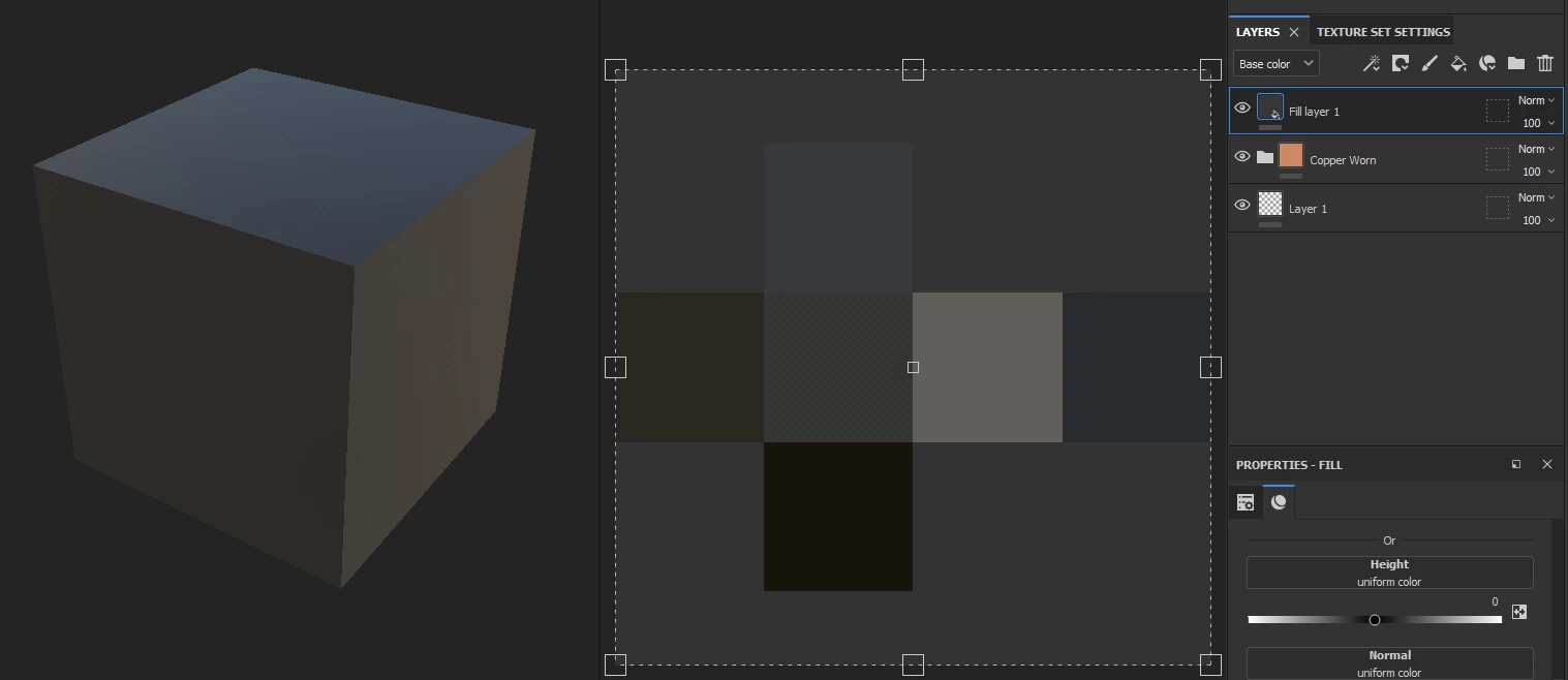 I’ve got a basic cube. I’ve tried both UV unwrapping in Cinema 4D (not up to speed with Blender yet), and I’ve tried Substance’s own auto unwrapping. I’ve exported the cube as an fbx. Imported it into Substance > New Project >