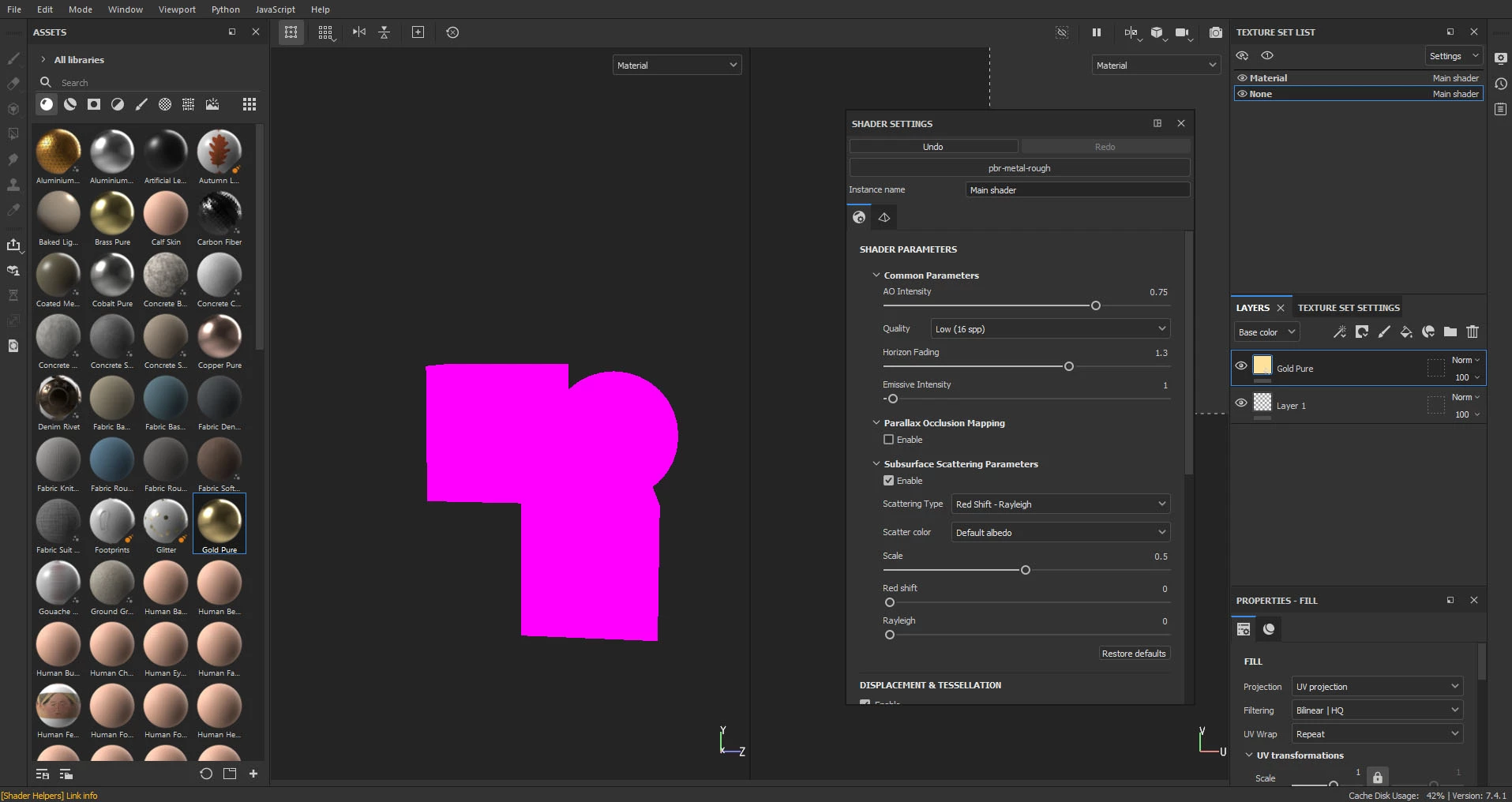 I opened a substance painter file .spp but all texture and geometry is flat pink in material mode in viewport. When I go through colour and the other channels, everything is fine, the problem is in material mode. If anyone has any idea why is this happening, please let me know.
