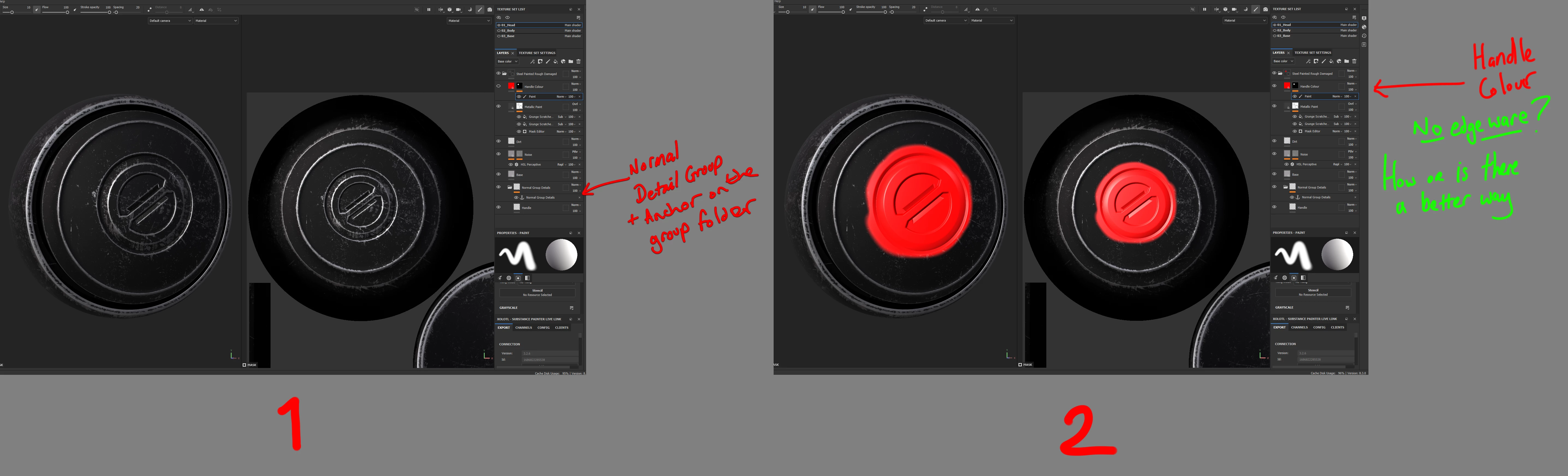 Is there a better way to add the edge wear to the painted section? I used a basic setup to hopefully show how the current folder structure is. The Normal detail group has its own folder with an anchor so it can be referenced by the edge wear generators etc. The trouble is if I add Normal (or Height details using the same separate group and anchor setup) you can't (or I can't think at the moment) how to reference the edge ware with some added paint to the handle in this example?