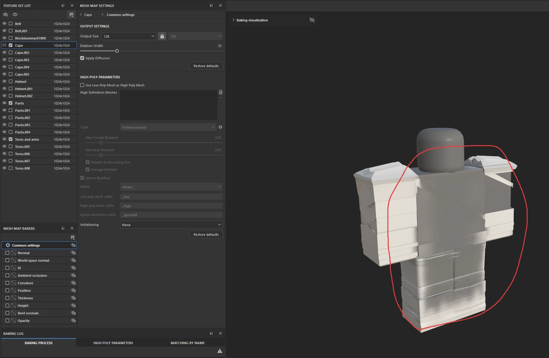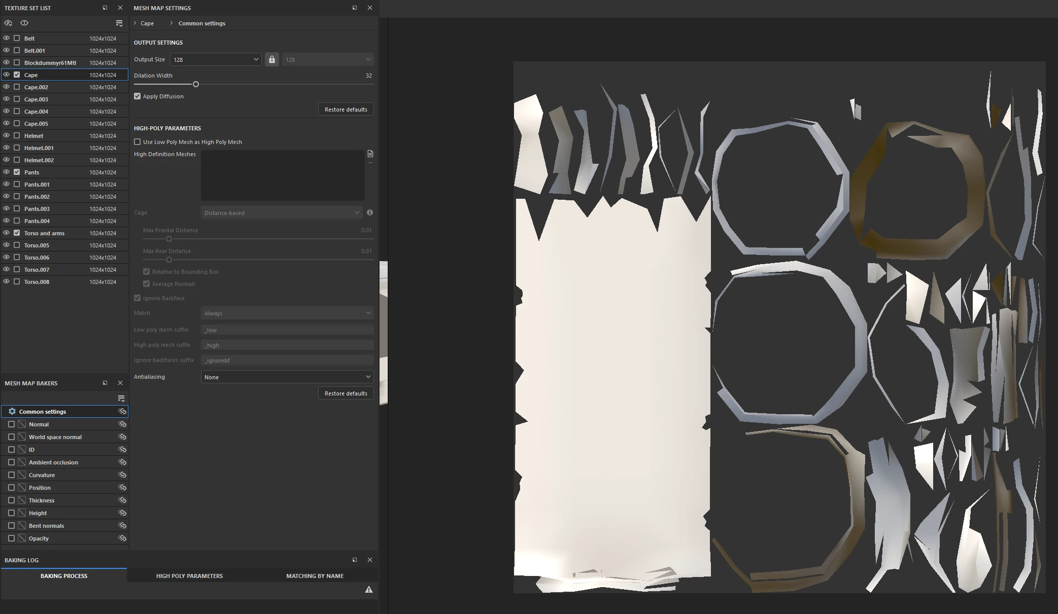 Hello everyone! I have three models: Cape, Torso and Arms, and Pants. When I bake them, the shadow from the Cape affects both 'Torso and Arms' and 'Pants.' I dont want that. I thought removing the Cape from the texture set list in the baking menu and rebaking , but that didnt help. How can I eliminate the Capes shadow?