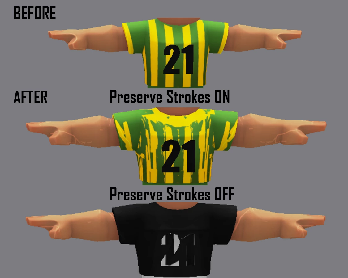 Model changes include ... scaled up overall, thicker arms and legs, longer arms. The model changed but UVs were NOT changed. The UVs are identical to the original model.