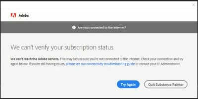 We are using an FRL liscence version on that PC to execute those tests, but even with that, we are having an issue. During our tests, when we open Substance, there's a warning that says "Are you connected to the Internet" with the message "We can't verify your subscription status". Here's a screenshot of the exact message, it's from the report generated by our tests: