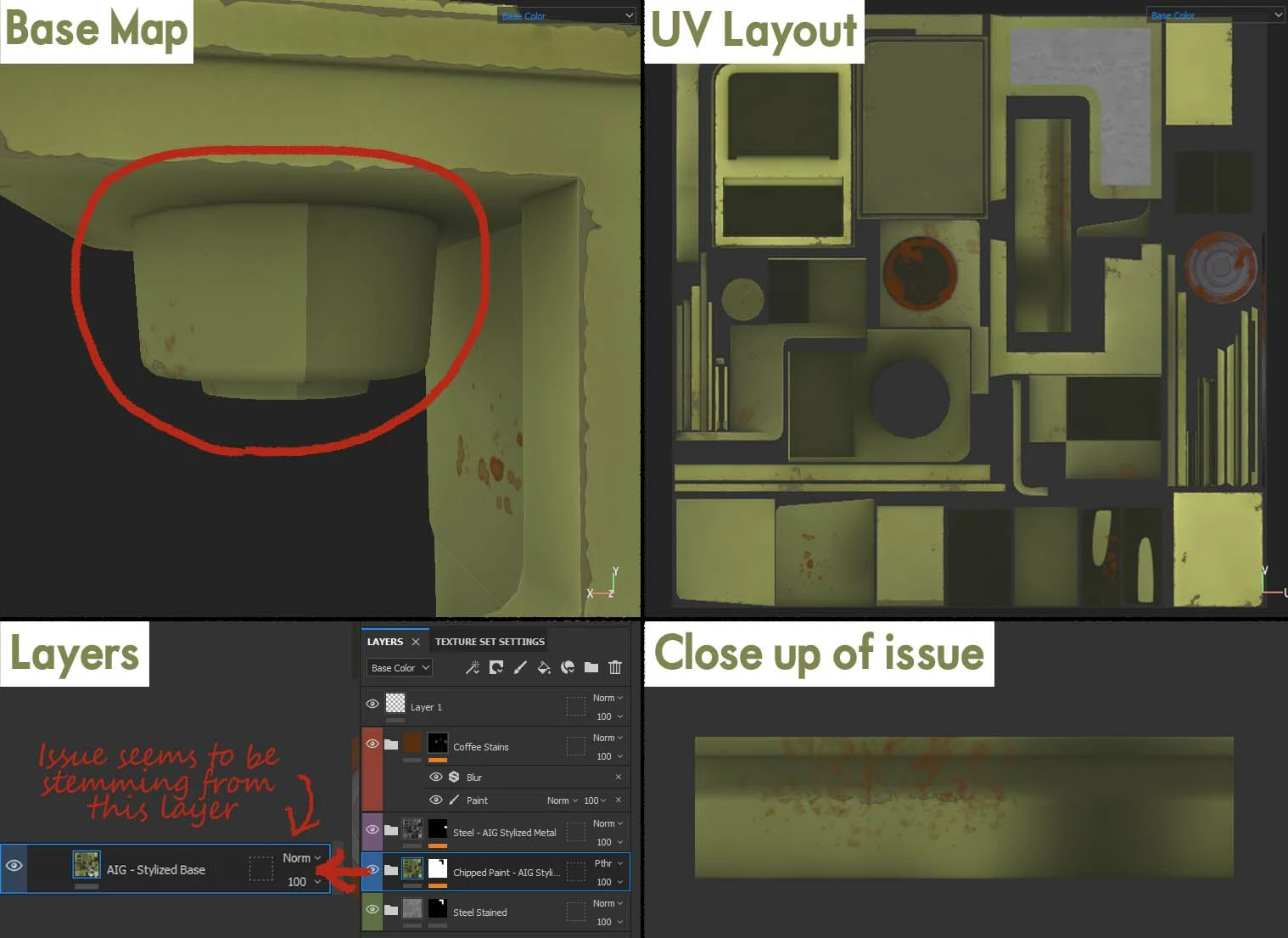 I have this issue where there's a very visible shading issue at the seam here. It's being caused by the stylized smart material I have applied. Any advice on how to fix this, and what I can do in the future to prevent this from happening again? It seems to have to do with the Base Map or Normal Map...