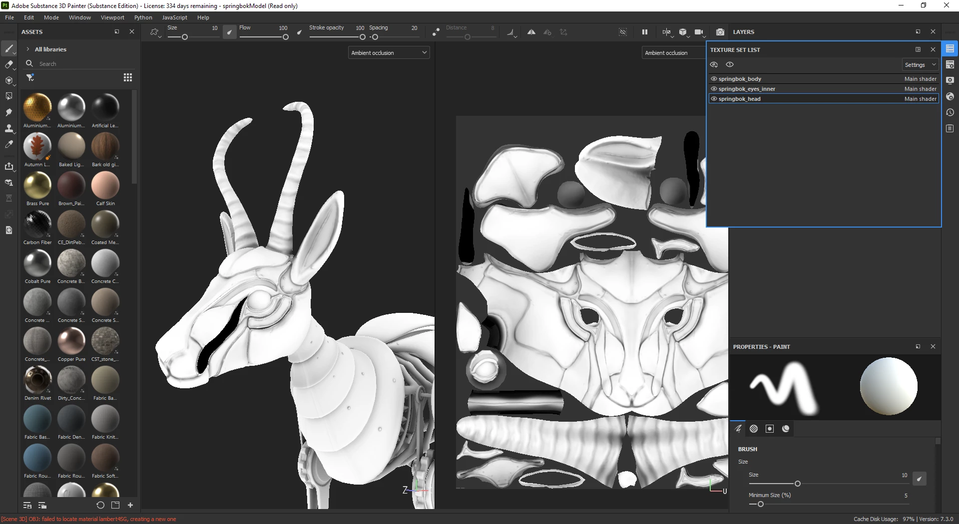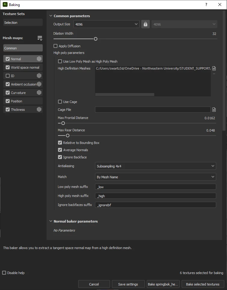 I have been encountering issues when trying to bake my high-res mesh in substance painter. As it can be seen in the attached image, one area of the mesh (which is a seperate piece) is not coming out properly - it is black in the AO map, and did not bake in any of the passes. It is named appropriately (_low and _high) and does not have any UV issues, it is also matched up with the low-res properly so I'm not sure why this is happening. When using "always" instead of "match by name" it works okay, but I wanted to try and understand why this issue is occuring. Attached are also the settings I used for the bake.