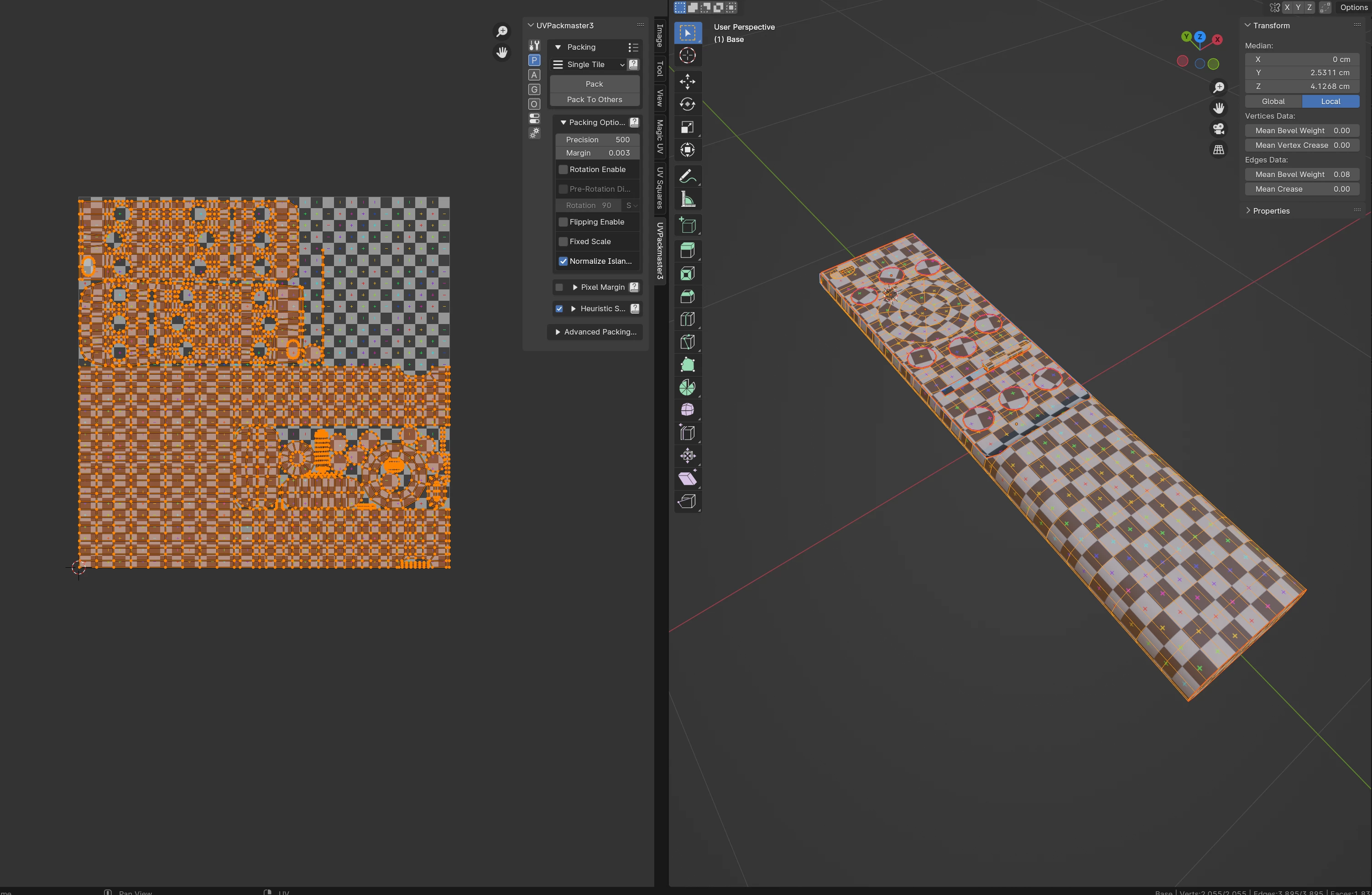 - The model was unwrapped in Blender and used UV Packmaster to pack the islands. There’s no overlapping geometry;