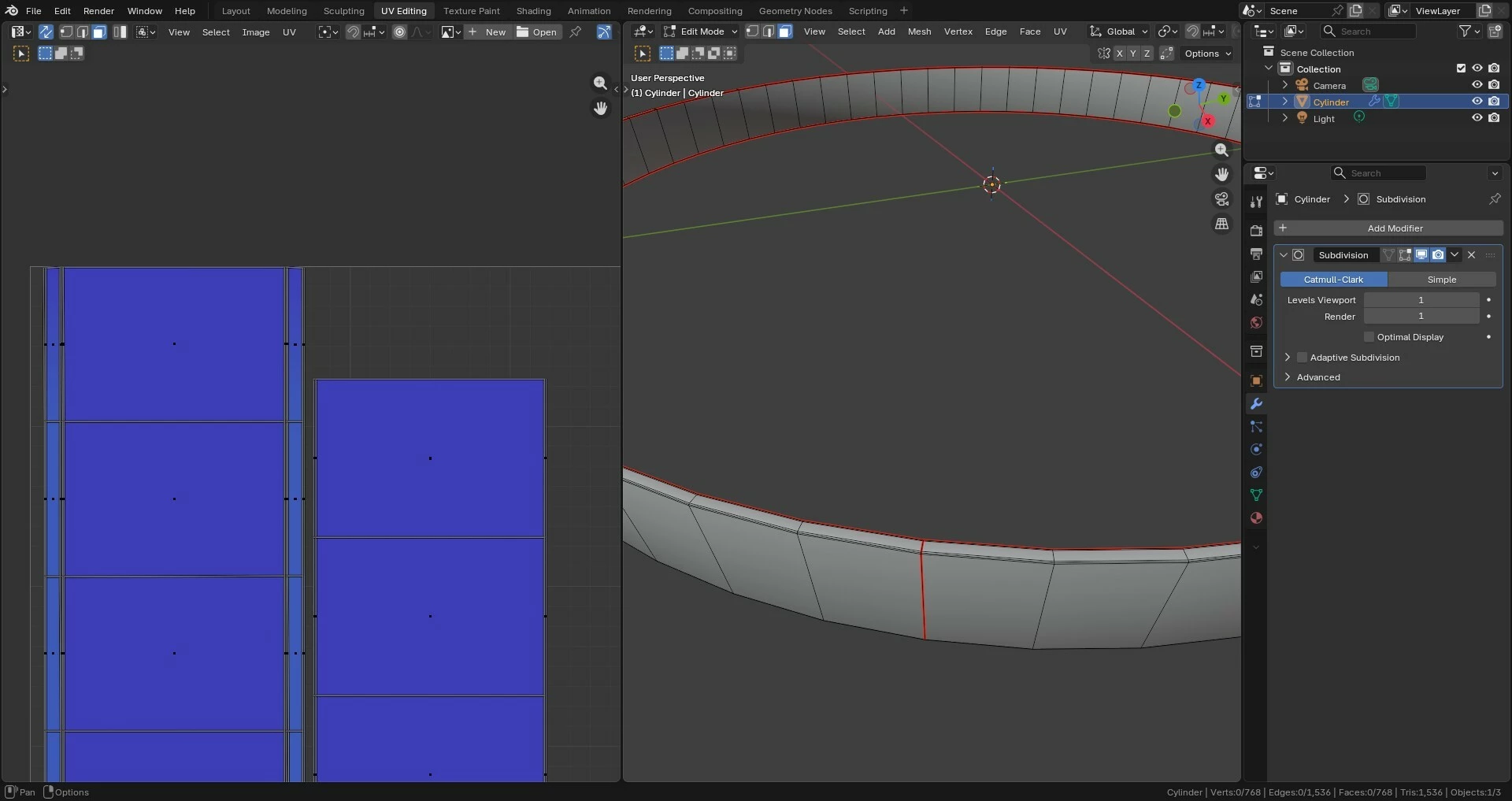 I created a simple, slightly conical circular band model in Blender (image 1). After UV unwrapping (image 2), I then exported the high- and low-poly models in FBX format.