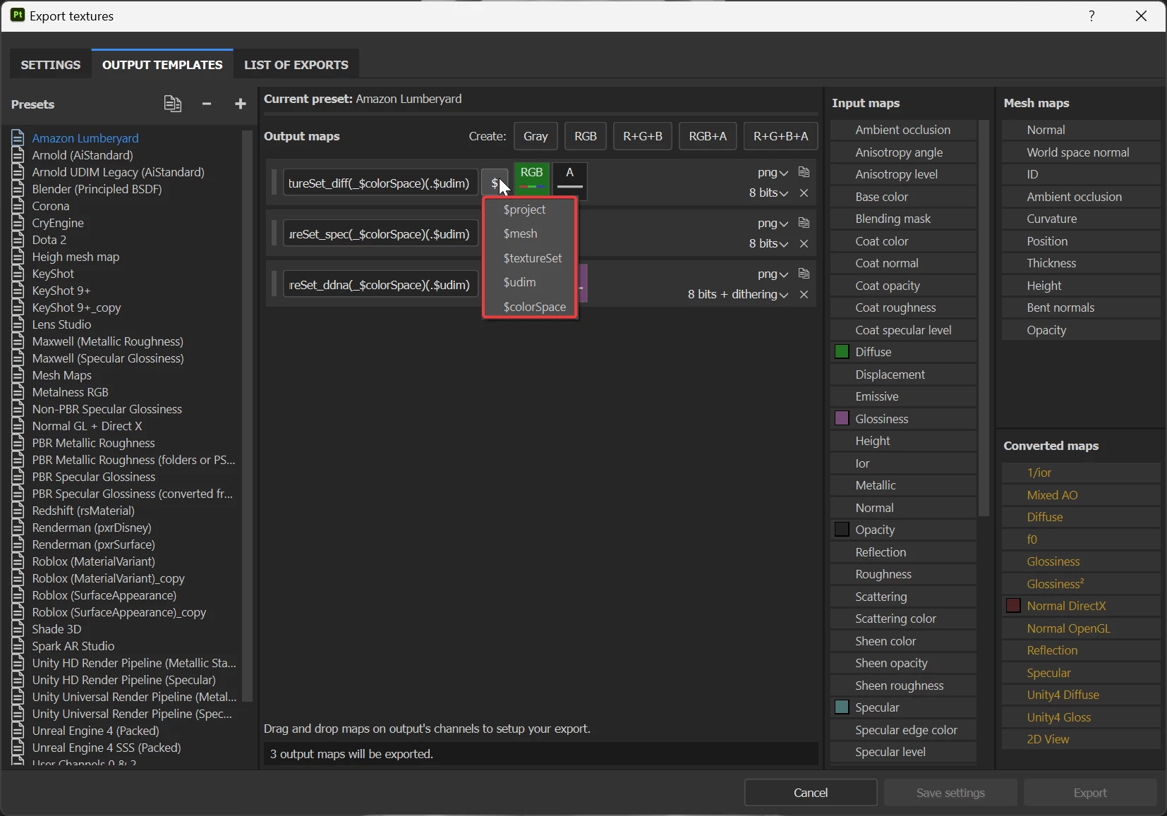 Hi, I am trying to make export presets to work with our pipeline. One of the things I would like to put in the name is the texture size. I have tried ($size) and a few other variations but nothing seems to work. There is no documentation of the valid export flags. Can anyone shed any light here?