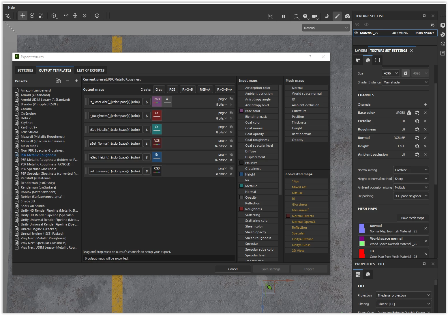 Everything is done using PBR metallic roughness . Pic 1 is the baked maps in Substance, Pic 2 is the Metallic roughness material node in Arnold. and Pic 3 is the maps that get exported from Painter [ using Metallic roughness ] Notice there is no AO map exported. also if you look at the Arnold material node there is a slot for AO but NOT for the height map. ! Hopefully someone will clear this up.