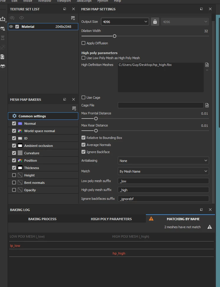 Hi so exporting more with baking and I trying to use the match by mesh name but I get this error that get me confuse. Now it says ot have the mesh name be _low and high and I did that but I get this error message that says the 2 meshes have not match so I'm a bit confuse. Here this is what I'm getting.  What is causing that even though I gave them the sufice that match.
