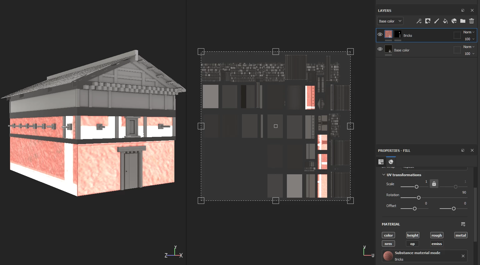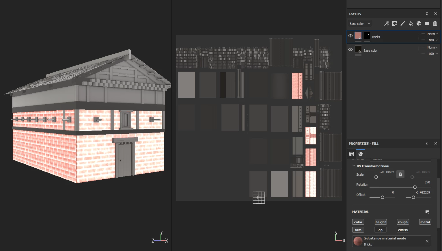 I have a house model, When I try to apply a brick material to it bricks are looking very big , So that I scaled down the material to adjust the size. But Quality of the material is lost. I attached the images of before and after scaling. Before scalling quality is good but size is very big, but after scaling down to correct size the resolution of the material is pixelated. Please some one suggest me to do this in correct way. This is not ony about the bricks, other materials are also behaving like this.