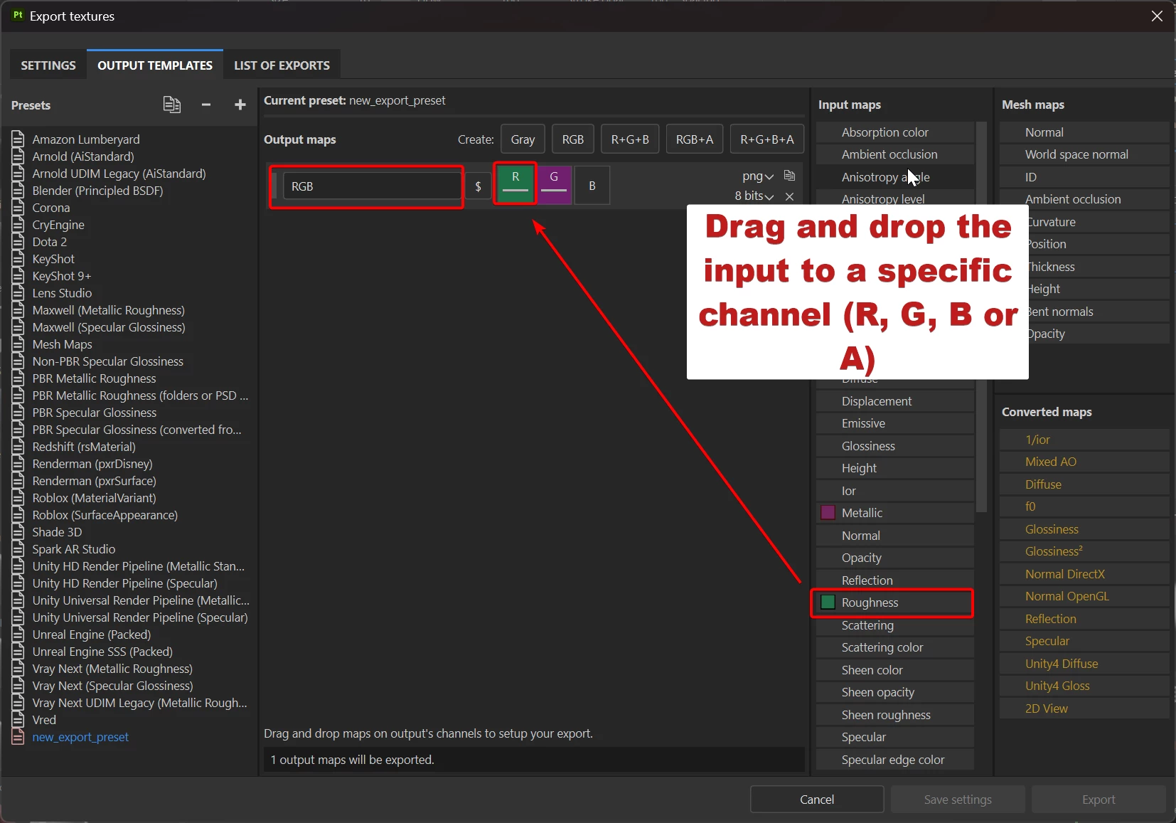 How do you export the roughness, metalness, AO, etc maps in RGB color formats?