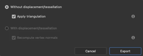 I would like to export a mesh with displacement but when I go to export mesh the option to export with displacement/tesselation is unavailable. I have included displacement in my channels and have enabled it in shader settings. Fwiw I'm on a mac