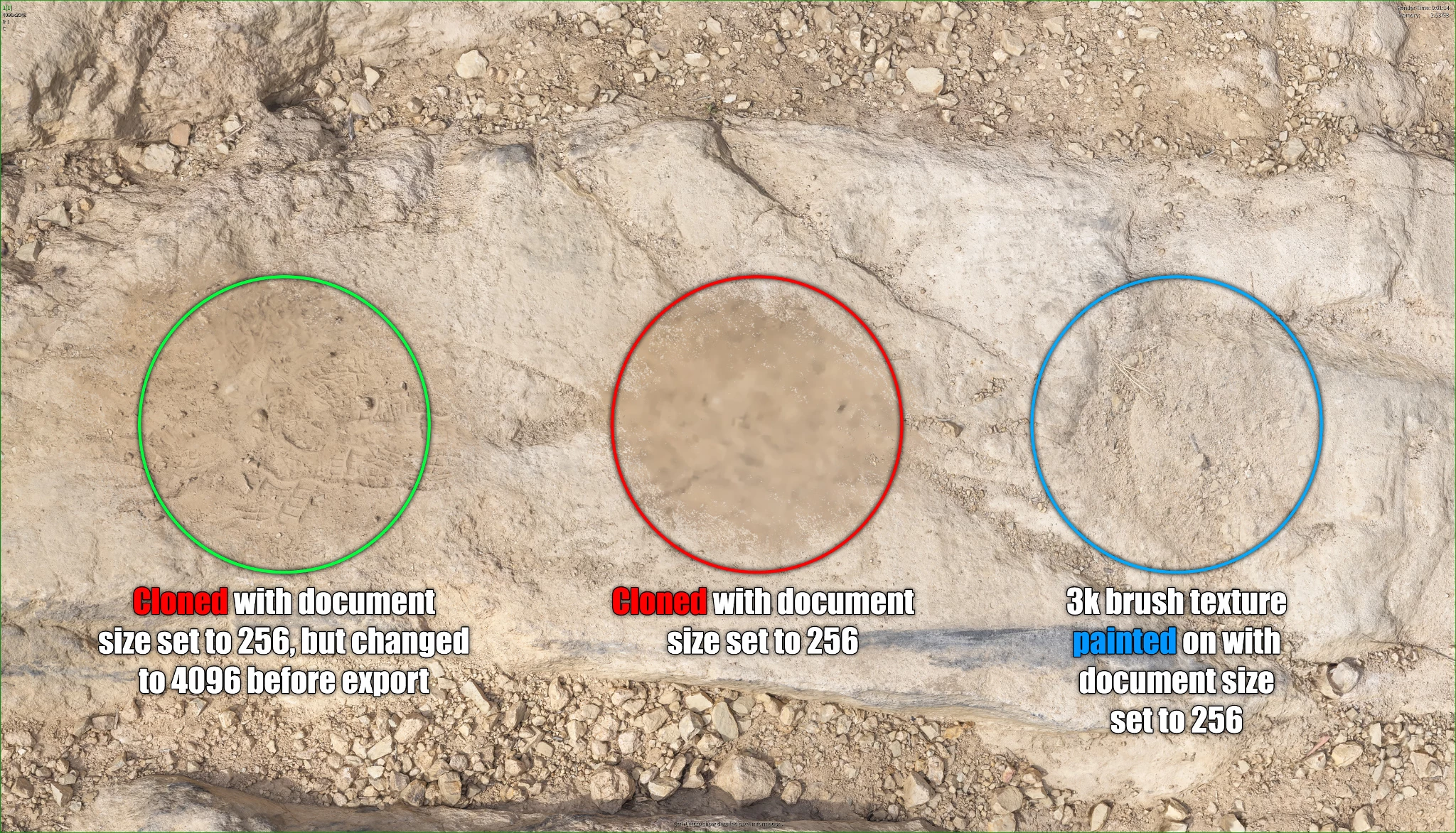 Attached is an example. The inputs and outputs of this model were 8K UDIMs. I cloned some areas with my document size set to 256. I also painted a stroke from a 3k brush while the document size was set to 256. Then i exported (at 8k). The red and blue circles were the result. Then i set my document size to 4k and rexported (at 8k). The green circle is the result.
