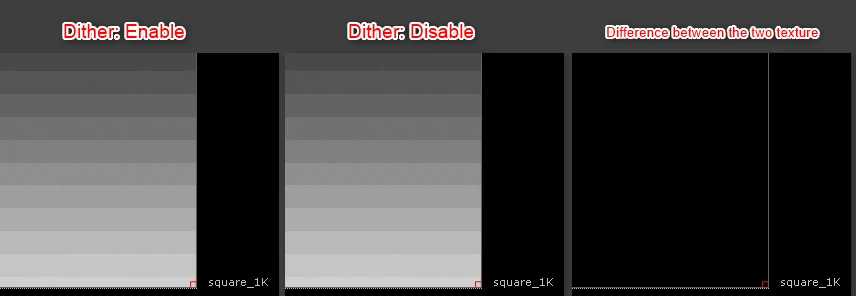 When I set the output to less than the texture output and exported it, I could not confirm Dithering on the display.